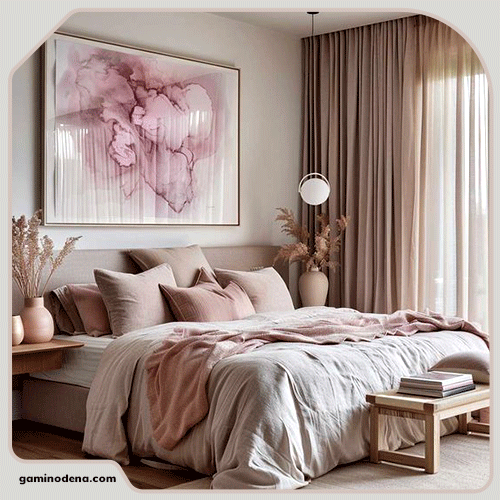 – رنگ صورتی: این رنگ نمایانگر عشق، آرامش و راحتی است. صورتی ملایم میتواند حس رمانتیک و دلنشینی را در اتاق خواب عروس و داماد ایجاد کند.