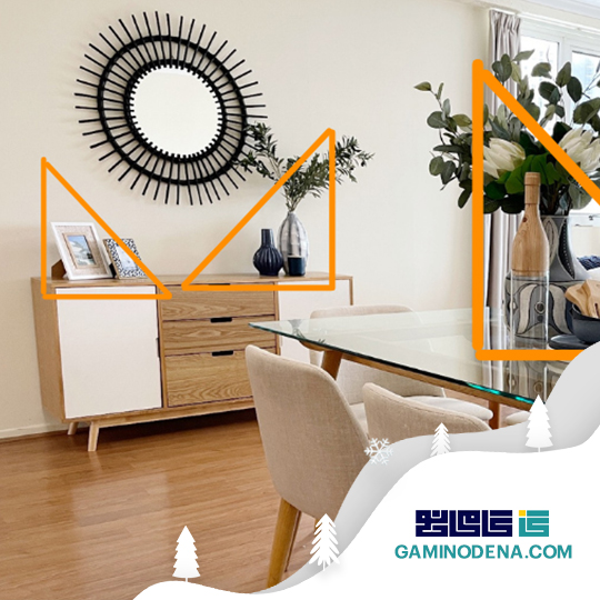 1. نقطه اصلی: این نقطه معمولاً بلندترین عنصر روی میز است (مانند یک گلدان بلند یا یک آینه بزرگ).