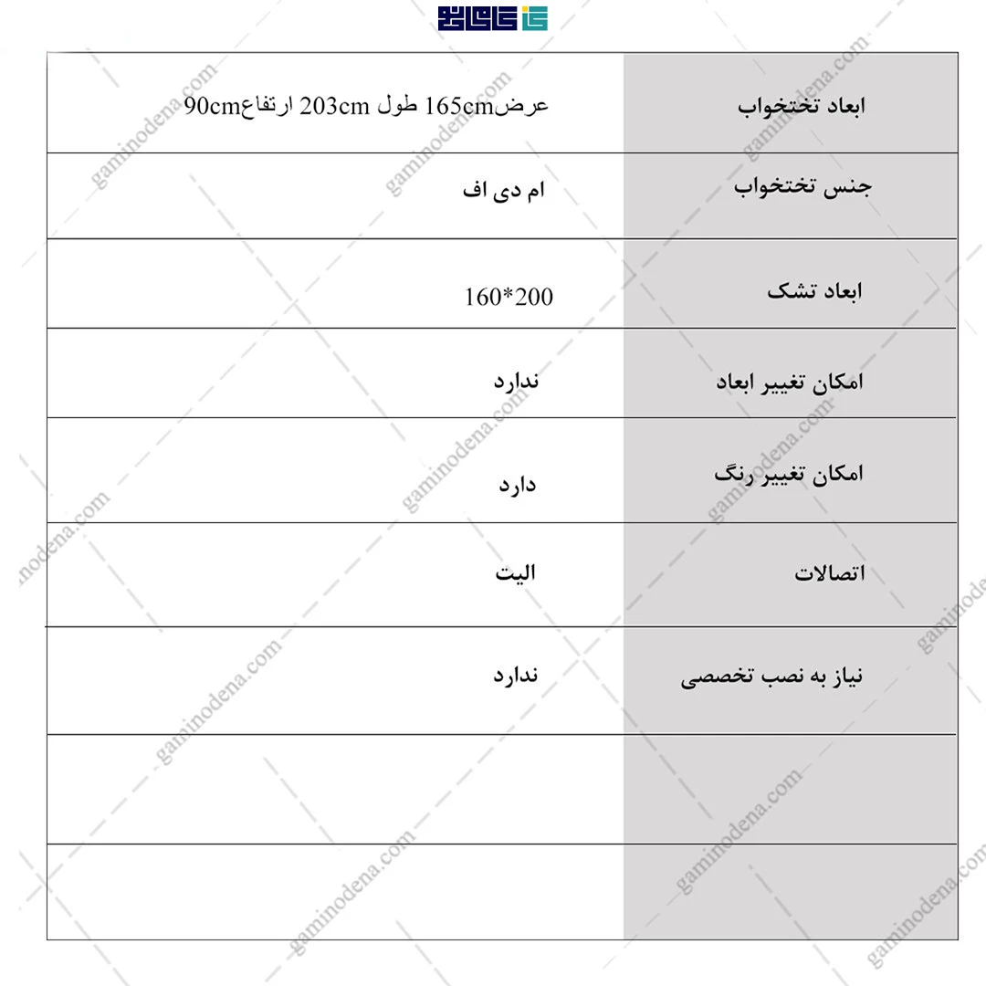 - ابعاد تخت : عرض 165 * طول 203 * ارتفاع 110 سانتی متر