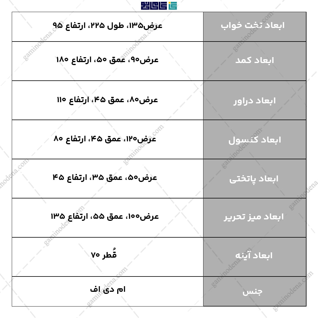- ابعاد تخت خواب: عرض 135، طول 225، ارتفاع 95