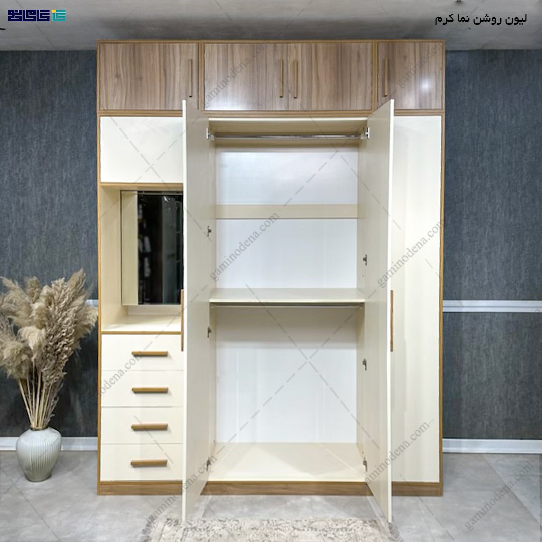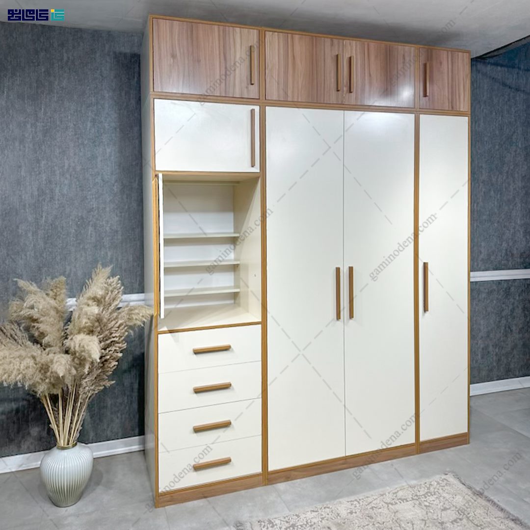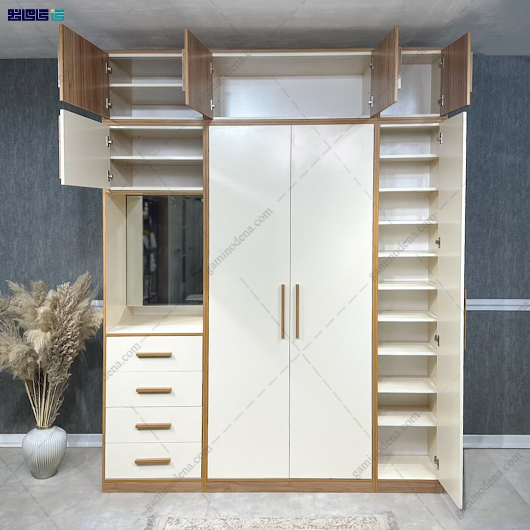 - در سمت چپ کمد: قسمت پایینی 4 کشوی جادار، بخش میانی آینه و در بالا 4 طبقه بندی درب دار تعبیه شده است