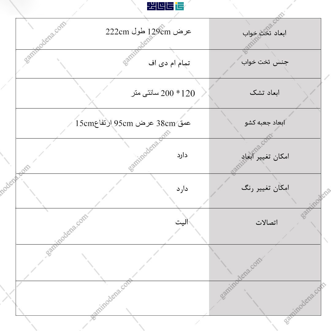 - ابعاد تخت : طول 222 ، عرض 129 و ارتفاع 90 سانتی متر