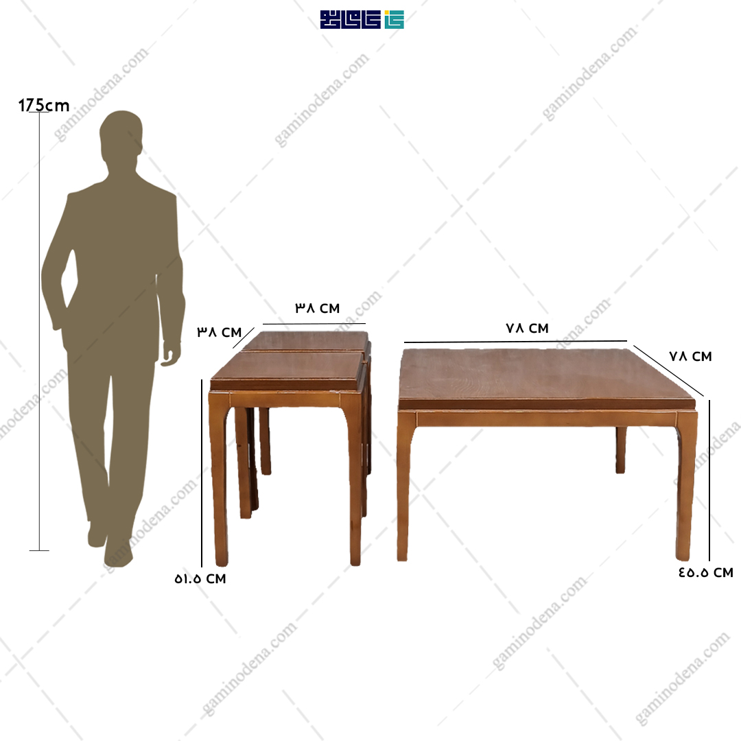 صفحه: عرض 40× طول 40 × ارتفاع 51.5 سانتی متر (با توجه به اینکه روی این محصول یک مربع کوچک تر از پایه است، عدد اعلام شده با احتساب بیرون زدگی صفحه ی بزرگتر زیرین است. ابعاد بدون احساب بیرون زدگی صفحه زیرین برابر طول 38× عرض 38 سانتی متر میباشد. ) - ابعاد میز جلو مبلی