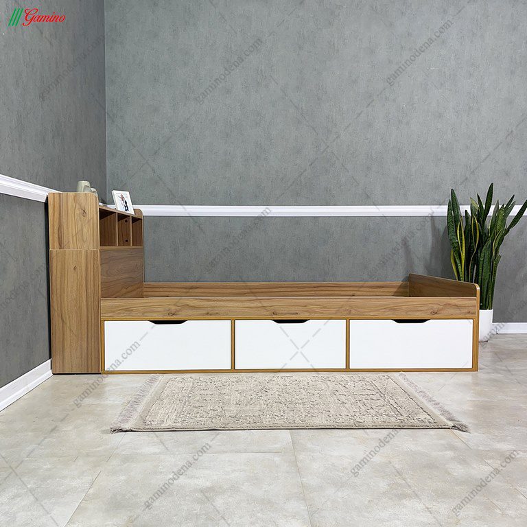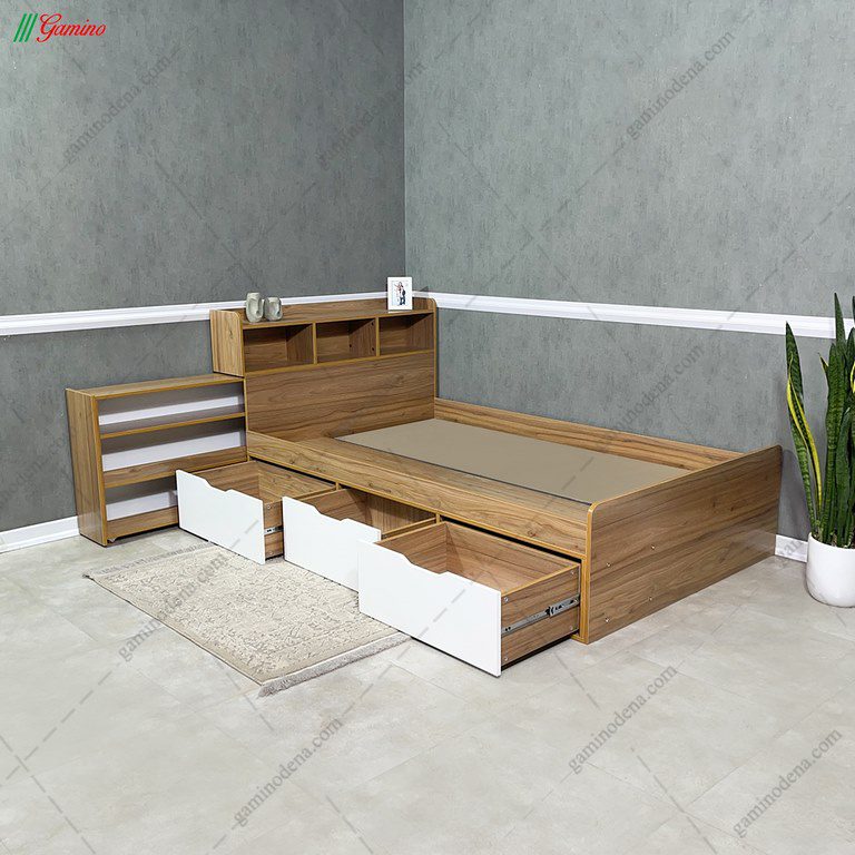 اگر به دنبال یک تخت خواب با قابلیت های فراوان هستید به شما تخت خواب کیوان را پیشنهاد میکنیم، این تخت دارای یک شلف مخفی ، قفسه و 3 کشو میباشد. شما میتوانید این تخت خواب 120 را در سایز های مختلف نیز سفارش دهید.