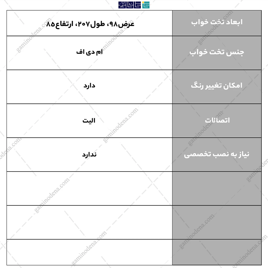 - ابعاد تخت : عرض 98 * طول 207 * ارتفاع 85 سانتی متر