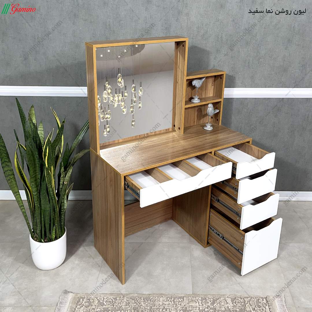 مهم: رنگ پیشفرض این محصول تمام لیون روشن می باشد اما در تصویر محصول رنگ میز آرایش لیون روشن با نمای سفید وارد شده است، اگر شما عزیزان قصد خرید با رنگ بندی متفاوت را دارید می تواند در قسمت یادداشت ها رنگ محصول و محصول مورد نظر را یادداشت بفرماید و یا با کارشناسان ما هماهنگ باشید.